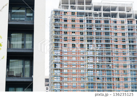 Logistics centers with solar panels on roofs under construction. Aerial view.
