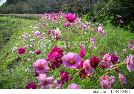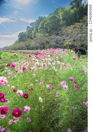 秋日田野裡盛開著色彩繽紛的波斯菊