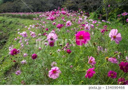 秋日田野裡盛開著深粉紅色的波斯菊。