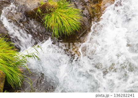 一幅構圖,捕捉了從正上方拍攝的鮮嫩綠葉和湍急山澗的景象。