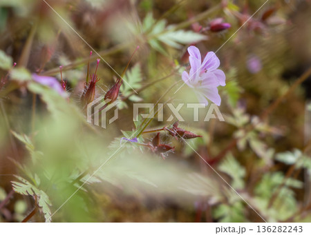 田野裡盛開著淡紫色的小花和綠色的葉子。