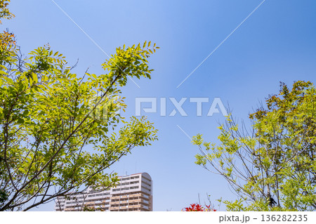 碧空如洗,翠綠的樹葉和城市建築映襯著藍天。