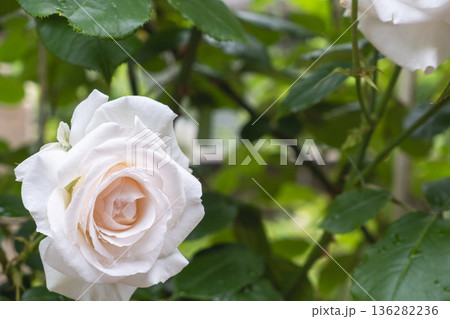 一簇簇乳白色玫瑰,花瓣上點綴著雨滴。