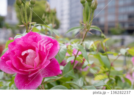 城市花園裡,盛開著綴滿水珠的亮粉色玫瑰。
