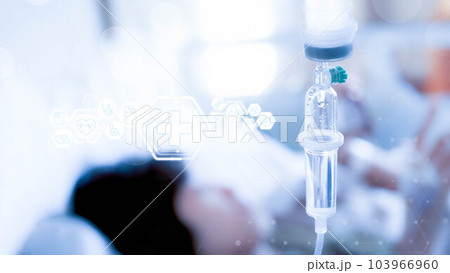 Set vitamin iv fluid intravenous drop saline drip with blur woman lying on bed in hospital room background. Medical Concept treatment emergency and injection drug infusion care chemotherapy concept.