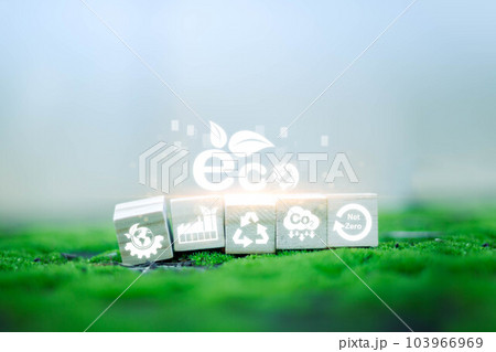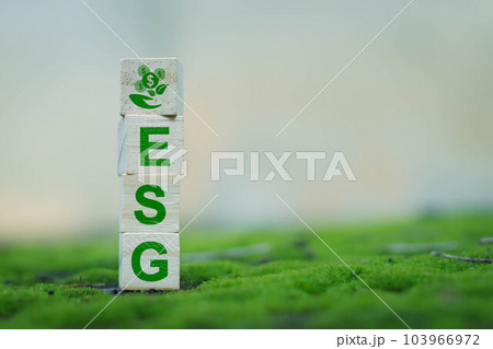 Blurred nature with cube wooden background and ESG concept of environmental, social and governance and impact investing. sustainable, funds, internet of thing, energy, ai, free space for text.
