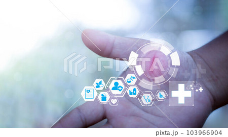 Hand holds wooden cubes with icons related Healthcare medical and Insurance concept on wood background, copy space, Service , financial concept.