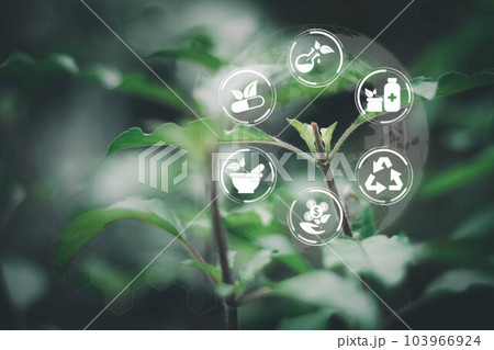 Alternative medicine with Futuristic ai technology concept. Natural herbal remedies. Organic pharmaceuticals, Smart virtual screen interface on blurred gentle nature background. Sustainable energy