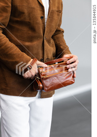 Close up of a stylish man in a brown suede jacket holding a tan leather wristlet clutch bag