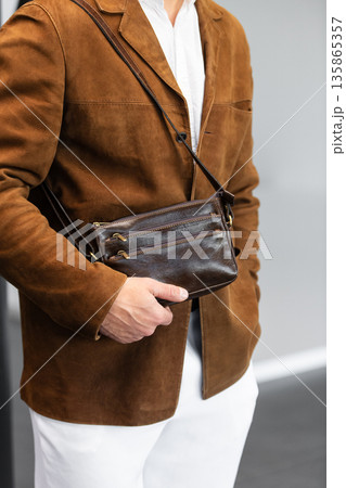 Close-up of a man holding a premium brown leather duffel bag wearing a suede blazer and white trousers
