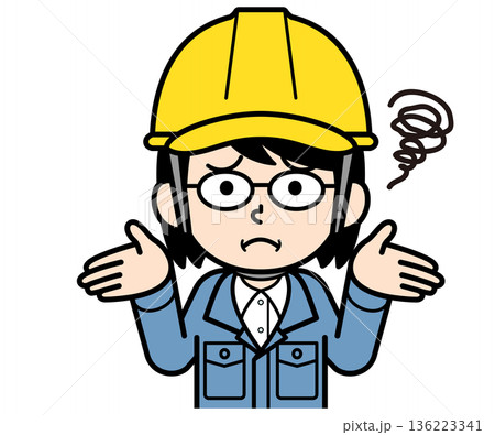 一位戴著安全帽的中年婦女在建築工地上疑惑地想著
