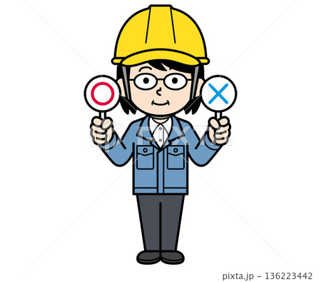 一位中年婦女在建築工地上,戴著安全帽,手裡拿著「是」和「否」的標誌。