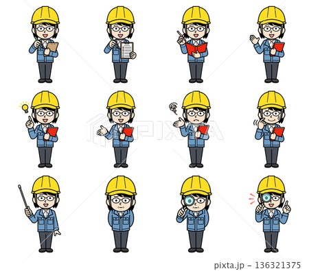 一組插圖,描繪了一位戴著頭盔的中年女工頭。