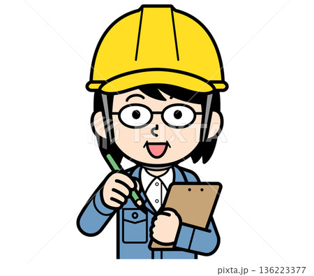 一位中年婦女在建築工地上戴著安全帽做筆記