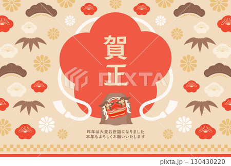 舞獅梅花框扁平老式三色新年賀卡設計模板
