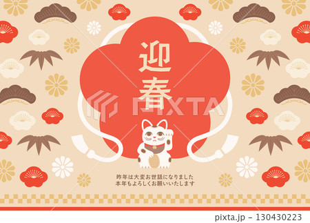 扁平、老式的三色新年賀卡模板,帶有招財貓和梅花框