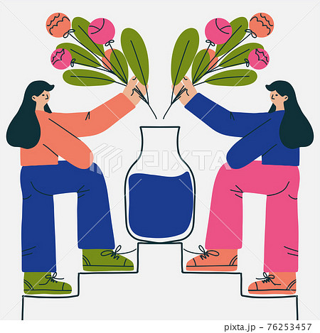 Gardener girls with flower bouquet, concept flowers shop, girls team flat