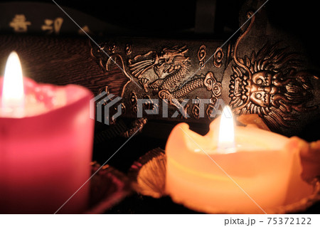 Candlelight illuminates the scabbard of an ancient Chinese sword with dragon
