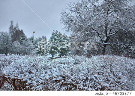 colorful Frozen winter forest and shrubs with snow covered trees.