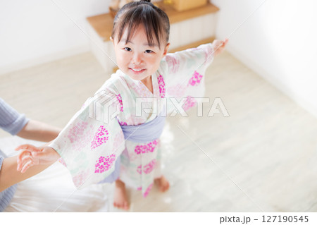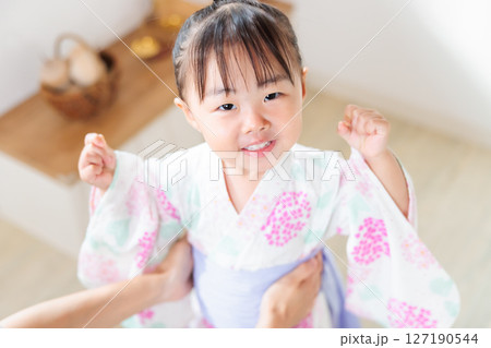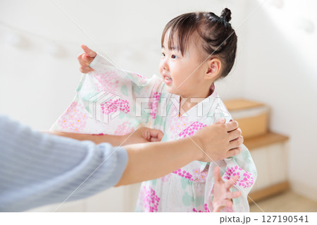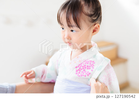 一名2歲女孩穿著浴衣。兒童浴衣穿法