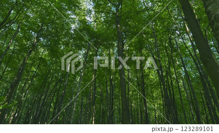 Crawl Through A Green Deciduous Forest. Trees With Sunlight Morning. Walking Through Forest. Wooded Environment Beauty With Bare Deciduous Trees. Moves slowly.