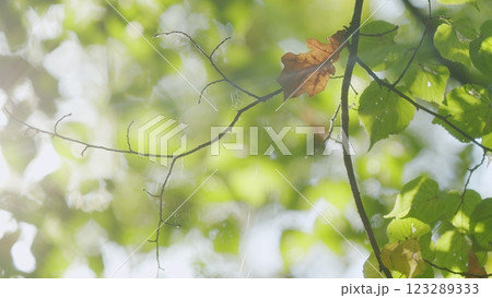Green Foliage On Forest Tree In Sun Light On Summer Morning. A Ray Of Sunshine Through Foliage Of Trees. Beautiful Spring Sun Shine Through Birch Tree Green Leaves. Bokeh.