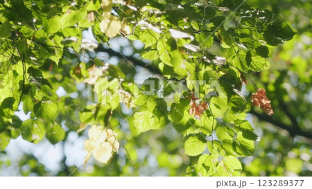 Beautiful Colorful Summer Season. Young Green Foliage In Park. Fresh Green Tree With Beautiful Sunlight. Green Wood. Slow motion.
