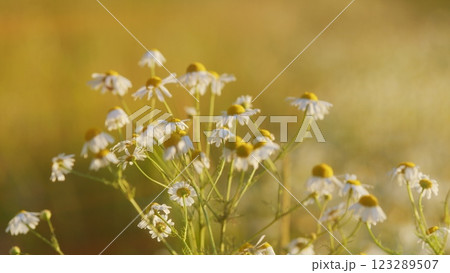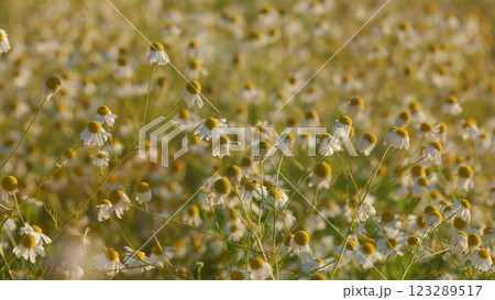 Chamomiles Swaying In Wind. Chamomile Flowers Field Background. Concept Of Fidelity. Summer Season Nature. White Flowers Field Meadow In Sunset Lights. Gimbal Stabilize.