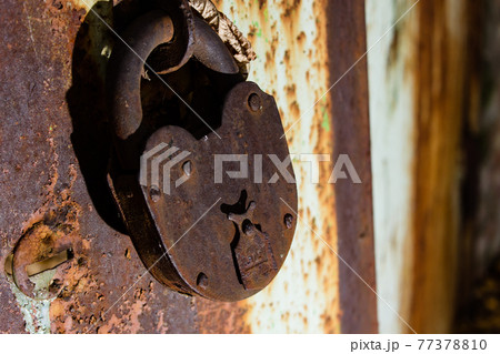 Rusty old padlock on an old metal door