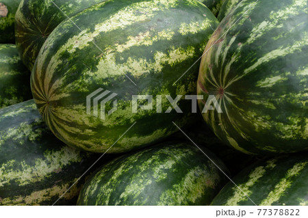 Ripe watermelons sell fresh produce on the market.