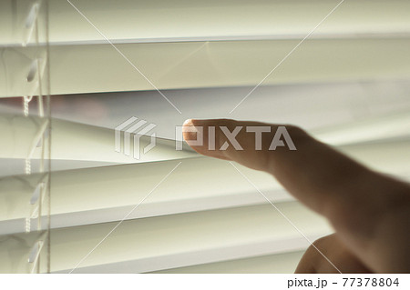 White metal blinds on the windows, daylight passes through the slots of the blinds, the human hand pushes the strip with the index finger