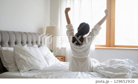 一名女子醒來後伸展身體的圖片