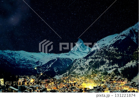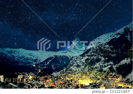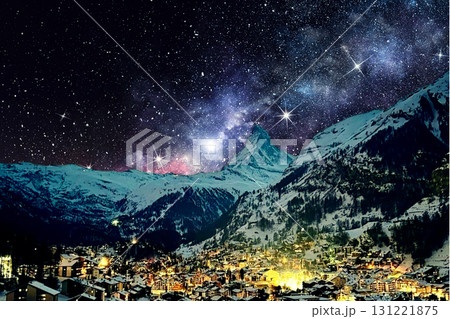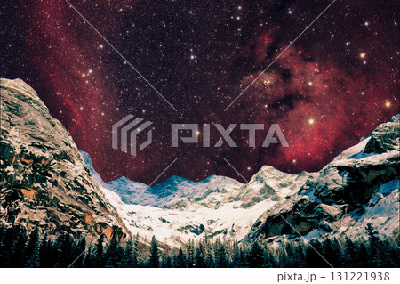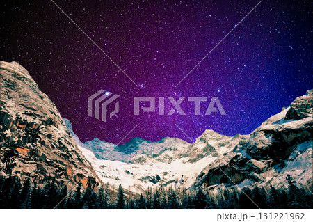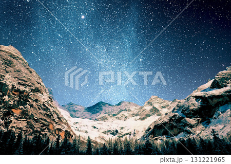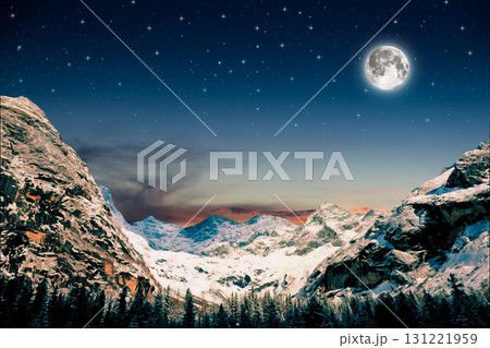 night view of snowy mountain range and milky way. starry night sky with stars and moon. beautiful landscape with snowy mountain peaks in winter night.