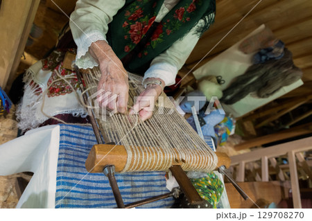 Close-up of skilled artisan's hand weaving fibers on traditional loom with natural materials
