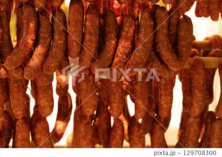 Hanging sausages drying in a warm environment with rich textures and appetizing colors