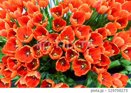 Vibrant orange tulips in full bloom creating a stunning floral display in a garden setting