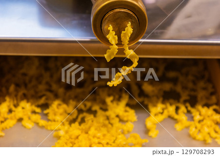 Freshly made pasta extruding from a machine onto a surface in a culinary setting
