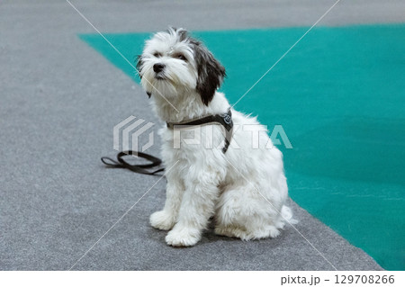 Small fluffy dog sitting on gray carpet with green background in a calm indoor environment