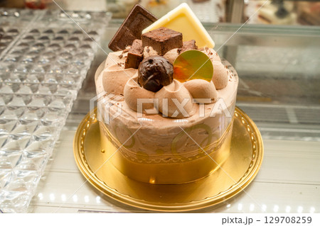 Chocolate cake topped with assorted decorations in a display case showcasing delicious dessert