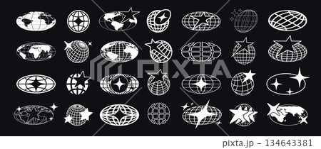 Retro Y2K globe logo. Minimal 2000s and 70s graphic with holographic posters with stars and groovy forms for global badge, decorative banner isolated vector elements