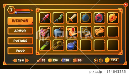 Game inventory. Fantasy RPG interface frame elements for adventure game with icons of weapon, armor, food, potions, stats and gold. Vector game GUI screen panel