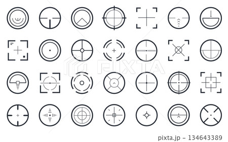 Target aim UI. Shooting focus crosshair, HUD sniper weapon accuracy sight, circle round square gun range optical mark. Vector military game interface target aims collection