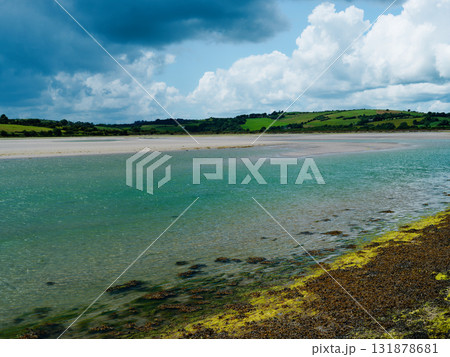 Waters meet green hills in West Cork under a partly cloudy sky. Patches of growth float on the water. The sky is filled with white clouds on a sunny day.