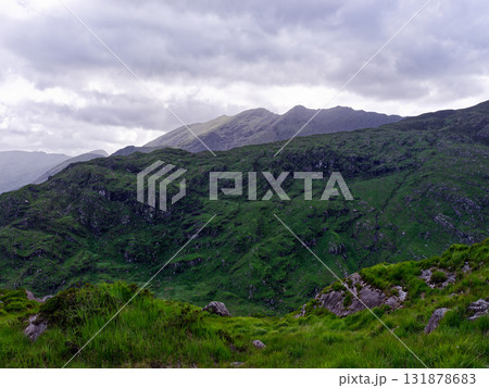 Overlook of lush green mountains in the Gap of Dunloe, County Kerry, Ireland.