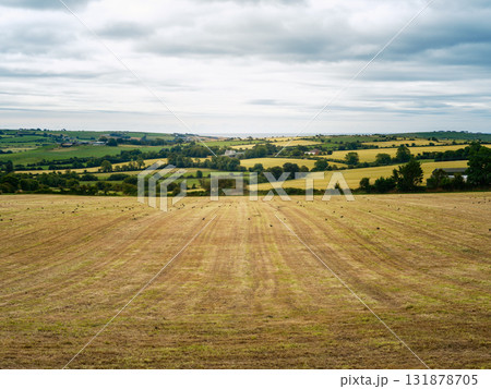 Rolling hills meet a vast, harvested field under a cloudy sky, suggesting a peaceful countryside scene.