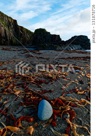 Early morning on Sheep Cove, Ireland. A single blue rock sits on a dark sand beach covered in seaweed. A rocky cliff rises in the background under a partly cloudy sky.