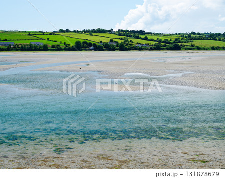 During low tide, the beach in West Cork, Ireland, exposes sandbars. Clear water surrounds them, and a seagull stands on a small exposed sandy area.