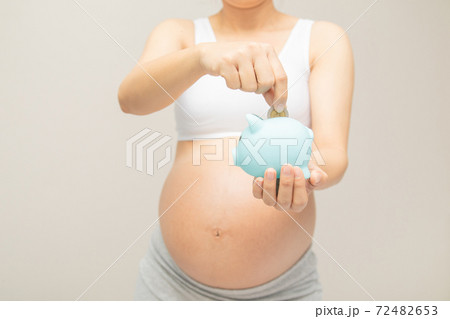 Money saving, donation, economizing, pregnancy, reservation, finance, investment and life insurance concept - young beautiful pregnant woman dropping golden coin into piggy bank glass for saving mone