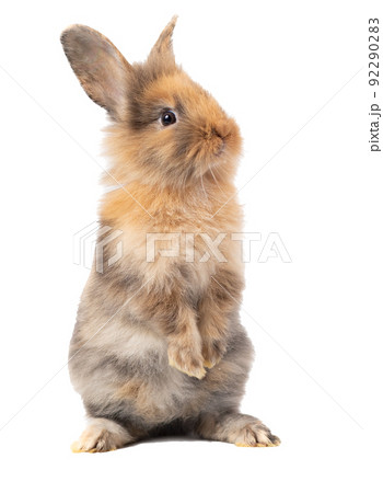 Brown or Three-colored new-born rabbit standing and looking at the top. Studio shot, isolated on white background with clipping path