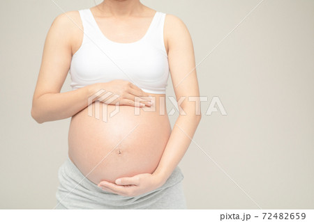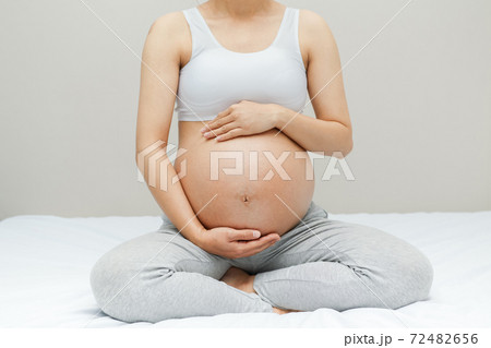 Pregnant woman touching her big belly. Close up. Motherhood, pregnancy, people and expectation concept. Pregnant woman expecting baby